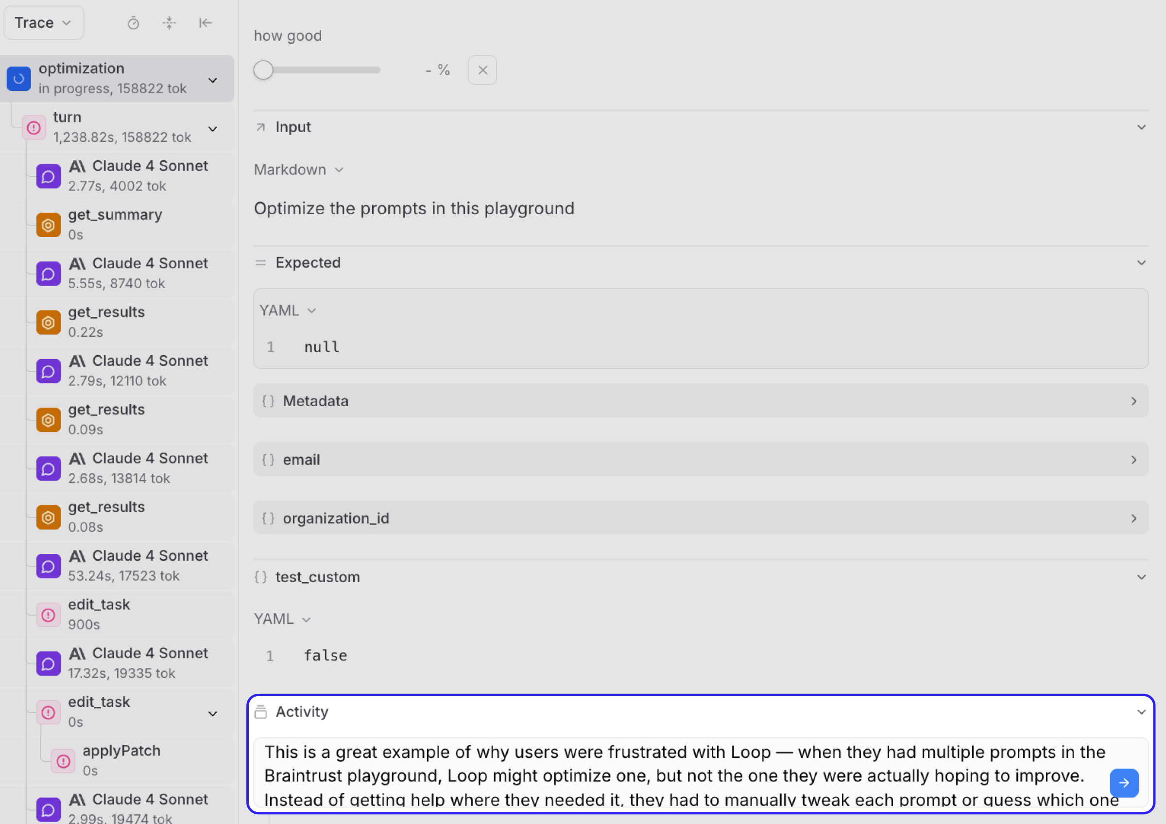 We put Loop's existing system prompt into the base task and ran the evaluation. From the trace view, we confirmed Loop was seeing all 3 tasks but automatically optimizing the first one without asking.