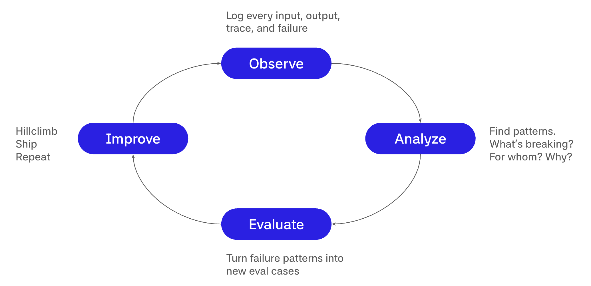 First, observe by logging every input, output, trace, and failure so you have full visibility into what your system is doing in production. Then analyze to find patterns. What's breaking, for whom, and why? This is where observability turns into product intelligence. Next, evaluate by turning those failure patterns into new eval cases, because every production failure is a candidate for your eval suite. Finally, improve by hillclimbing against your updated eval suite, shipping the improvement, and repeating.