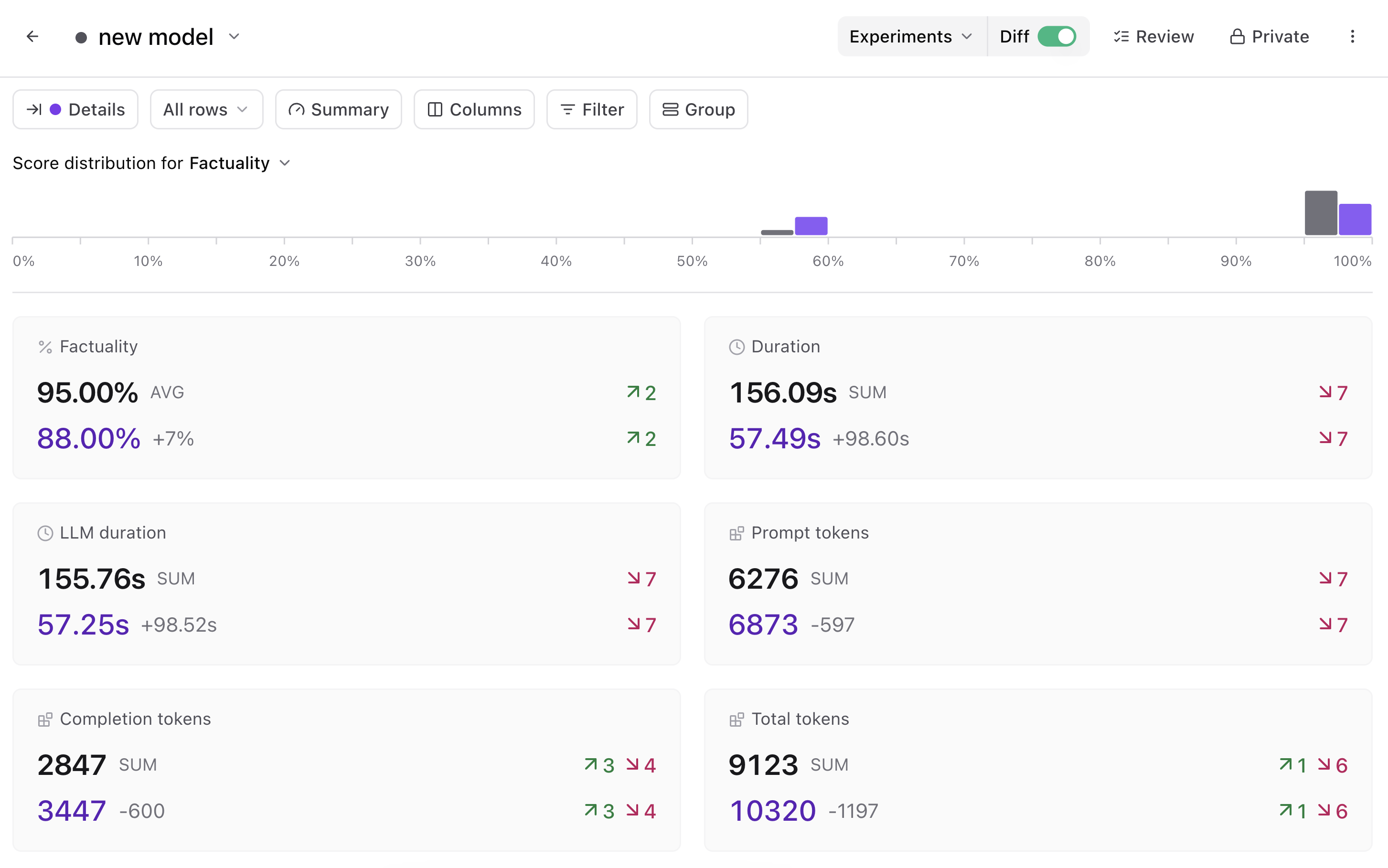 After shipping the new model in production, you can keep tabs on its performance on the Monitor page. To focus on your model change, select Group by model and tighten the timeline to when you made the changes.