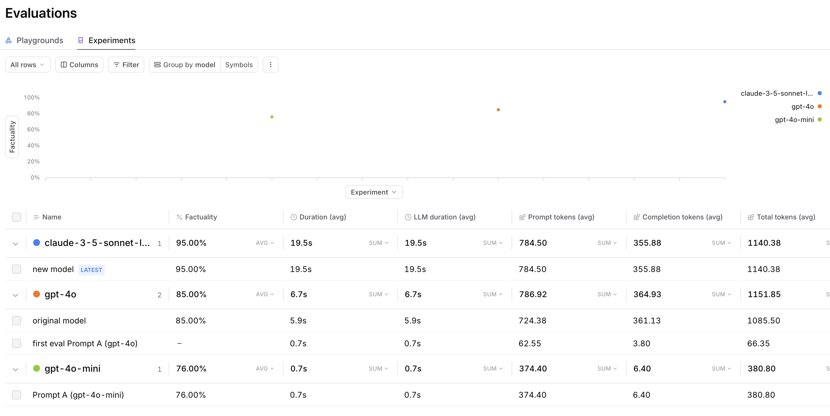 Importantly, you should also closely monitor your overall scores to ensure you are not regressing in any areas. To do so, you can use the Group by menu in the Experiments pane to see the results of your evals sorted by model.